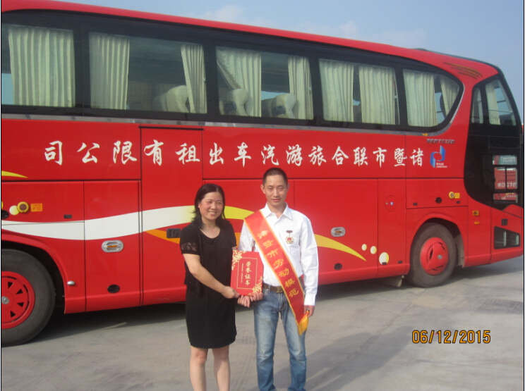 2015年5月1日,公司员工王锡绥同志荣获诸暨市劳动模范称号,并参加表彰大会。王锡绥同志在一直以诚实劳动、创造性工作活跃在公司一线,从一线旅游大巴驾驶员逐步成长为车队长、修理部负责人,他始终与公司发展保持同步调。他以身作则,率先垂范;他换位思考,做好服务;他勤学苦练,完成角色转变,提高综合素质,他带着团队捧回“第六届世界合唱大会运输保证优胜单位”“省级安全先进集体”等诸多荣誉,本人也获得“市十佳客运驾驶员”、“世合唱赛优秀驾驶员”、“百万公里安全驾驶员”等荣誉称号。