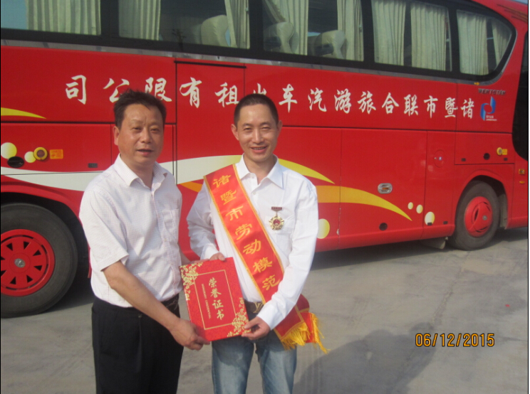 2015年5月1日,公司员工王锡绥同志荣获诸暨市劳动模范称号,并参加表彰大会。王锡绥同志在一直以诚实劳动、创造性工作活跃在公司一线,从一线旅游大巴驾驶员逐步成长为车队长、修理部负责人,他始终与公司发展保持同步调。他以身作则,率先垂范;他换位思考,做好服务;他勤学苦练,完成角色转变,提高综合素质,他带着团队捧回“第六届世界合唱大会运输保证优胜单位”“省级安全先进集体”等诸多荣誉,本人也获得“市十佳客运驾驶员”、“世合唱赛优秀驾驶员”、“百万公里安全驾驶员”等荣誉称号。